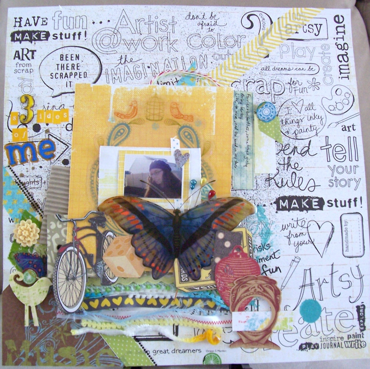 So far, layouts, either one of two pages. I just finished a two-page layout for my little person’s first birthday. I’ve start making cards, which I sell on my Etsy shop, called ScrapMusings. And I’m starting to get into altered art, mixed media, and mini albums. I’m loving getting messy, and I love layers.